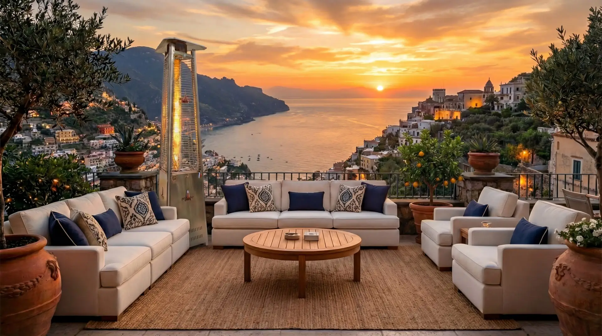 Updated Traditional Heaters focus on reimagining classic “mushroom” patio heaters with Italian coastal style. These pieces keep the familiar, umbrella‑style silhouette guests recognize, but refine every detail—sleeker lines, quieter performance, richer finishes, and a curated Amalfi Coast palette.