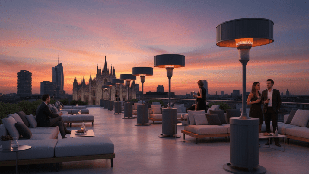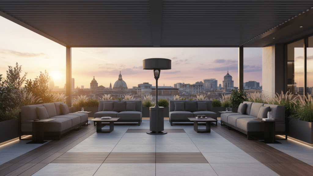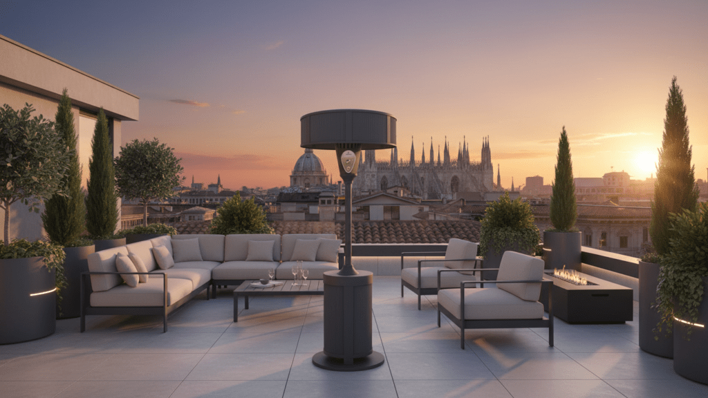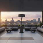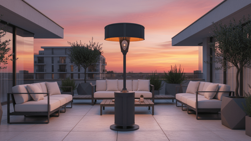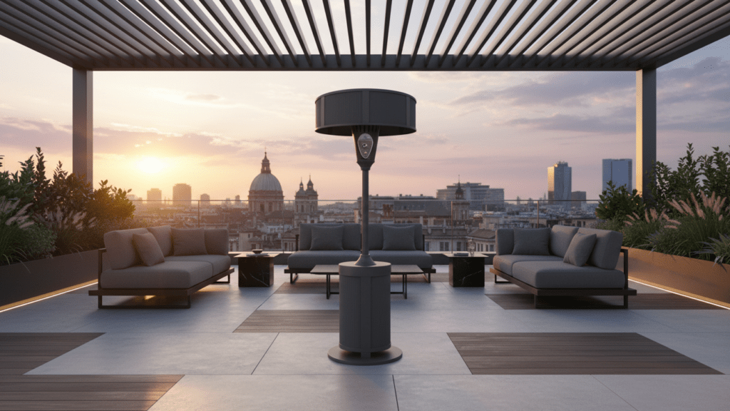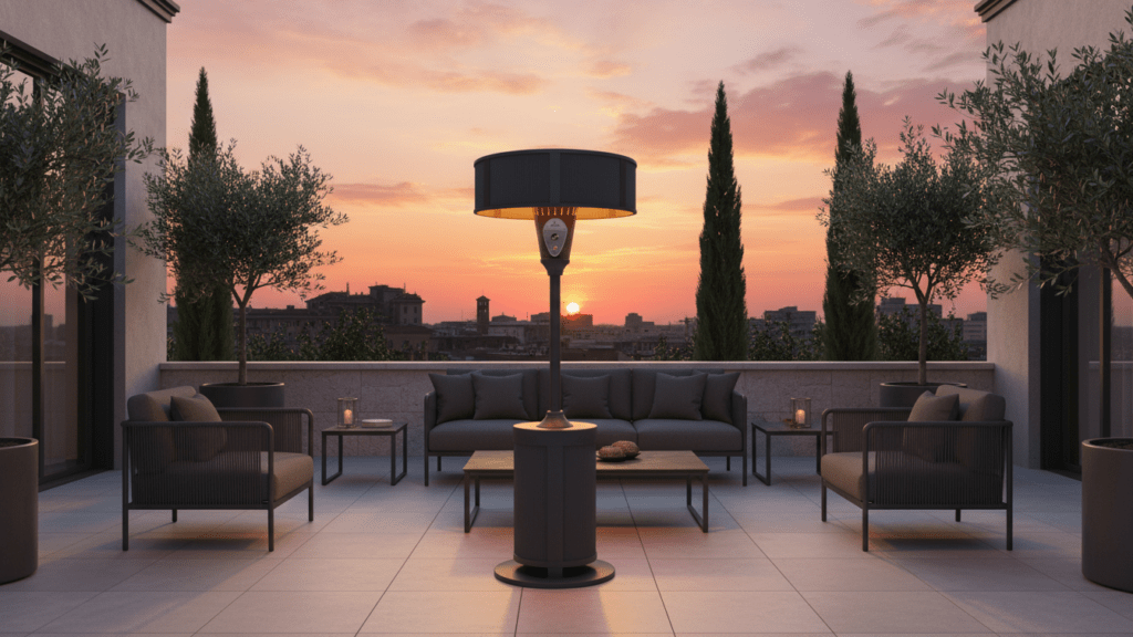 Bring the Amalfi Coast home with the Amalfi Halo Lounge patio heater in Vespero Slate, a sophisticated halo‑style heater designed for modern terraces and luxury outdoor lounges. Crafted with a sculpted column and oversized drum shade, it delivers enveloping, overhead warmth while keeping sightlines clear for conversation and cocktails. The Vespero Slate finish combines deep charcoal and soft gray tones for a refined, coastal‑inspired look that pairs seamlessly with teak, stone, and contemporary outdoor décor. Engineered for efficient, even heat distribution, the Amalfi Halo Lounge transforms cool evenings into golden‑hour moments, season after season.